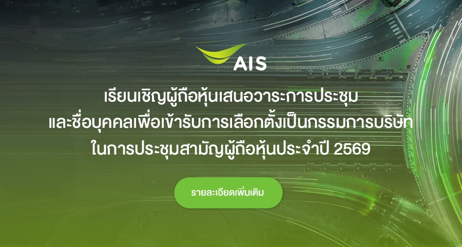 เอไอเอสเป็นมากกว่าผู้ให้บริการด้านโทรคมนาคมและเทคโนโลยี เรายังเป็นพันธมิตรที่มีความน่าเชื่อถือ ที่มุ่งมั่นสร้างการเติบโตในโลกดิจิทัลอย่างมั่นใจให้แก่บุคคล ธุรกิจ และสังคม เราตั้งใจส่งมอบบริการที่ดีที่สุดและสร้างประสบการณ์ดิจิทัลที่ไร้รอยต่อ เพื่อเป็นส่วนสำคัญในการสร้างการเปลี่ยนแปลงที่ยั่งยืนในสังคมยุคดิจิทัล