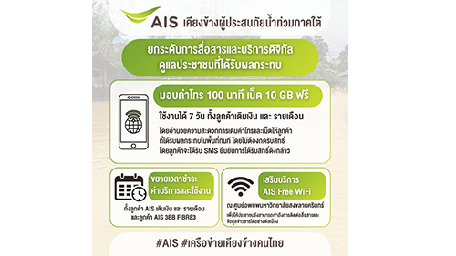 เอไอเอส เคียงข้างผู้ประสบภัยน้ำท่วมภาคใต้ ยกระดับการสื่อสารดูแลประชาชน มอบค่าโทร-เน็ตฟรี ขยายวันใช้งานและเวลาชำระค่าบริการมือถือ-เน็ตบ้าน พร้อมดูแลเครือข่าย 24 ชั่วโมง