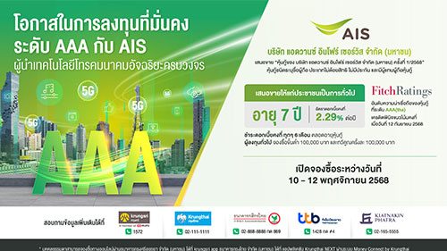 เปิดโอกาสลงทุนมั่นคง! AIS เสนอขายหุ้นกู้ 7 ปี ที่ 2.29% ต่อปี ต่อประชาชนทั่วไปด้วยความน่าเชื่อถือระดับ AAA ระหว่างวันที่ 10 - 12 พ.ย. 68